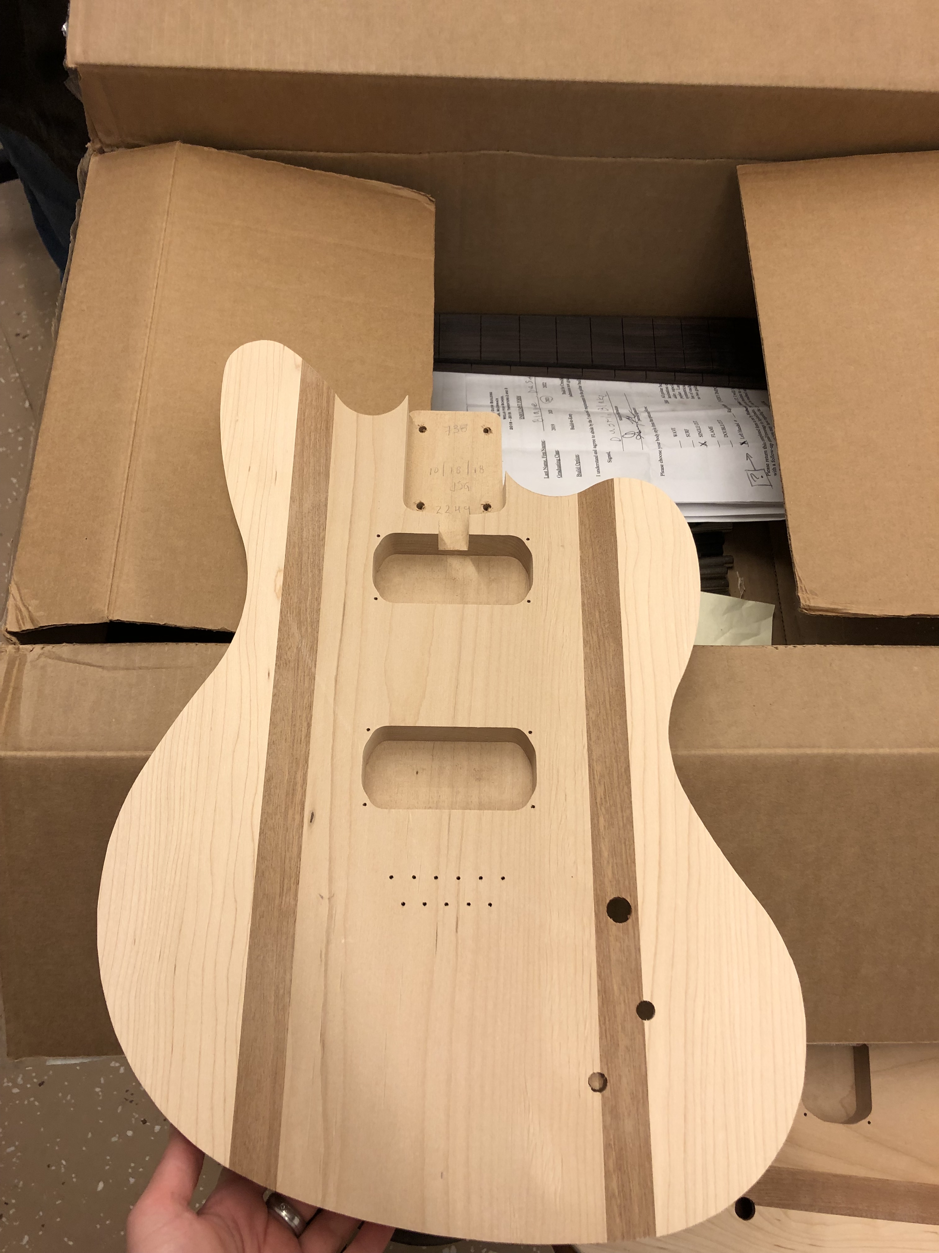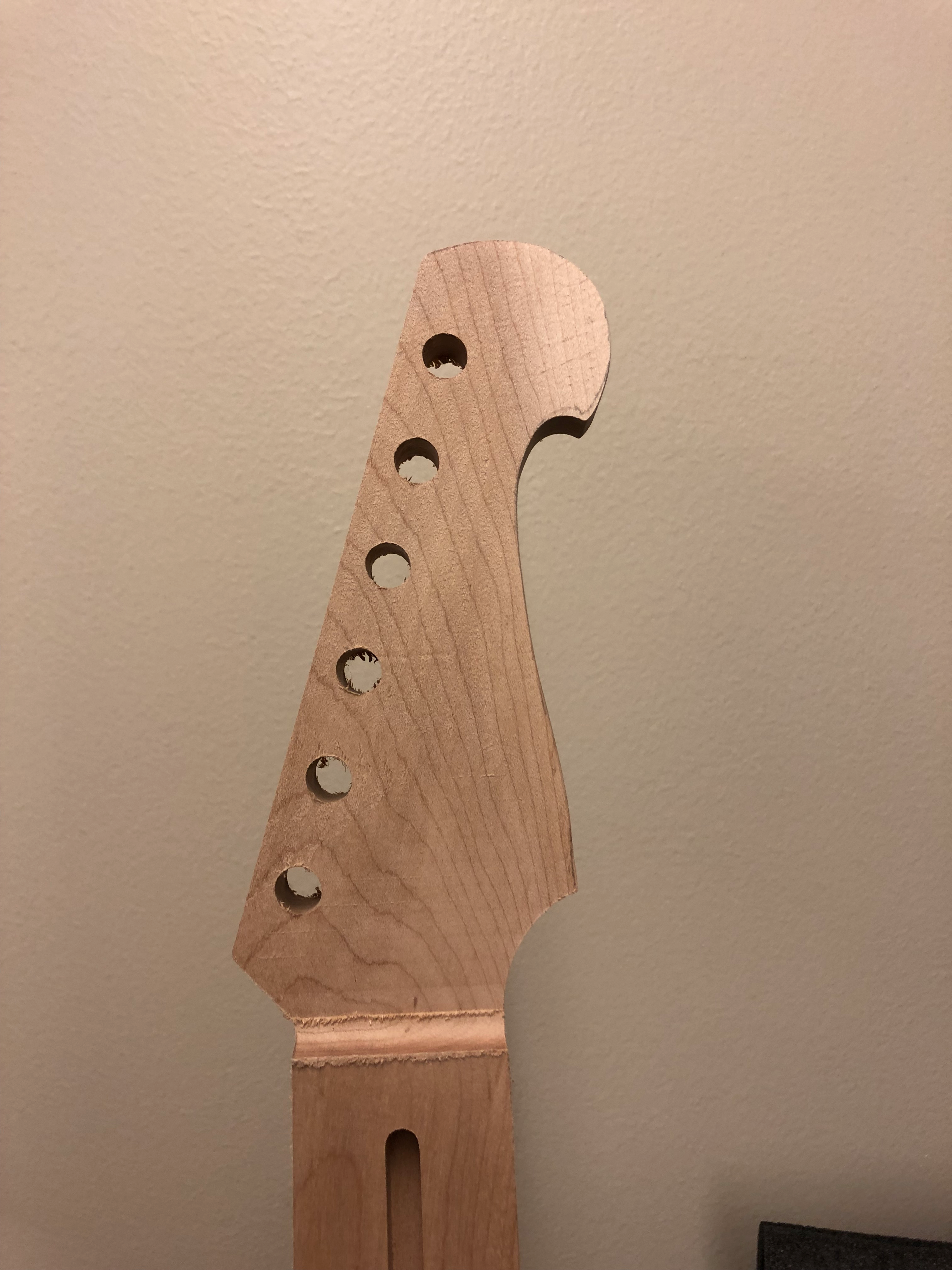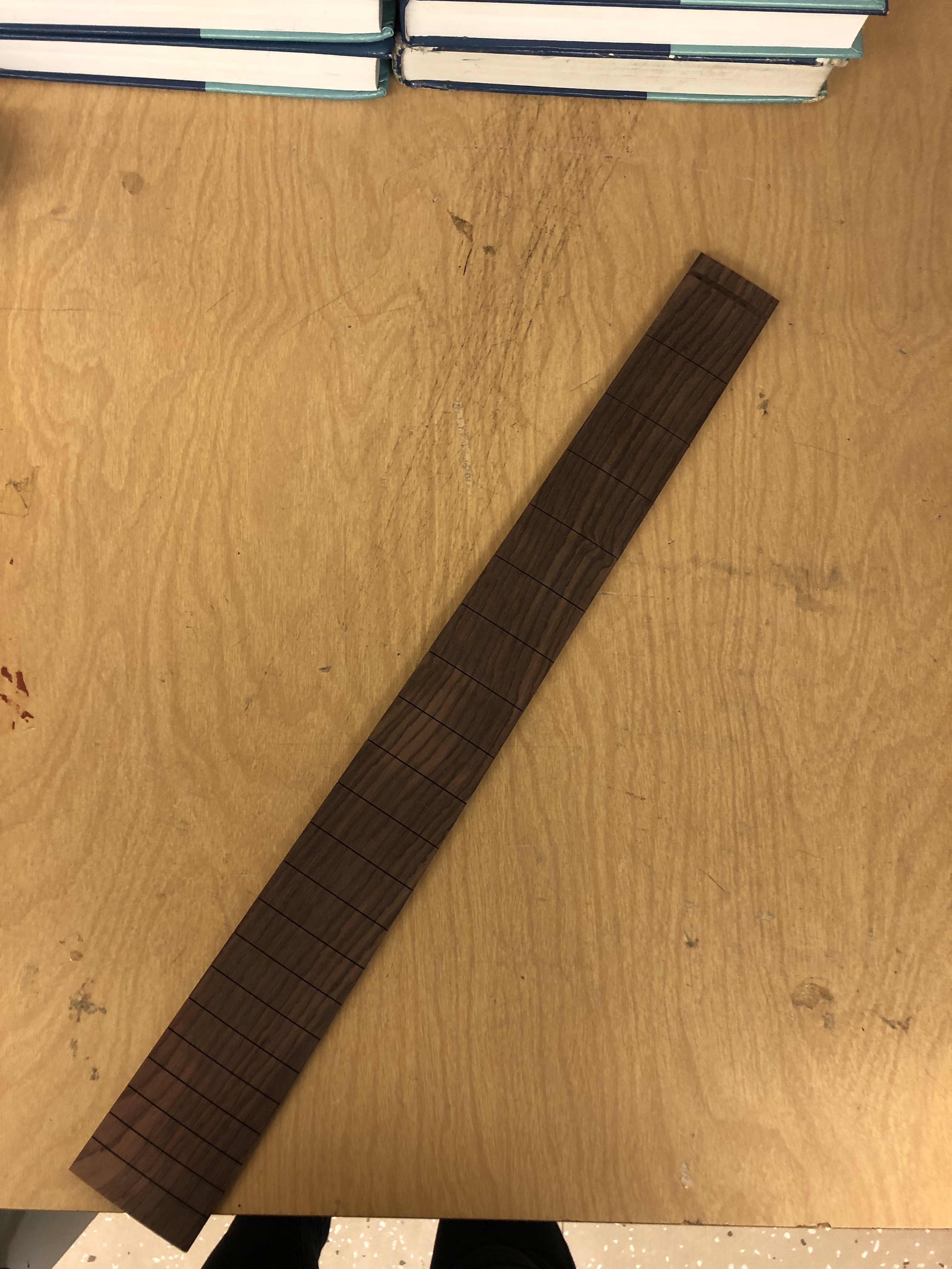 Accomplishments: This week I started with my fingerboard and finished sanding the top of it with a 12′ radius sanding block and cleaned out the dust and made the slots deeps enough for the frets to be placed in. I also cut out my headstock and sanded it using a belt sander and a spindle sander. To complete the sanding I used sandpaper to smooth and round out the edges. Finally, I started on working on the body and smoothing the edges with the belt and spindle sander