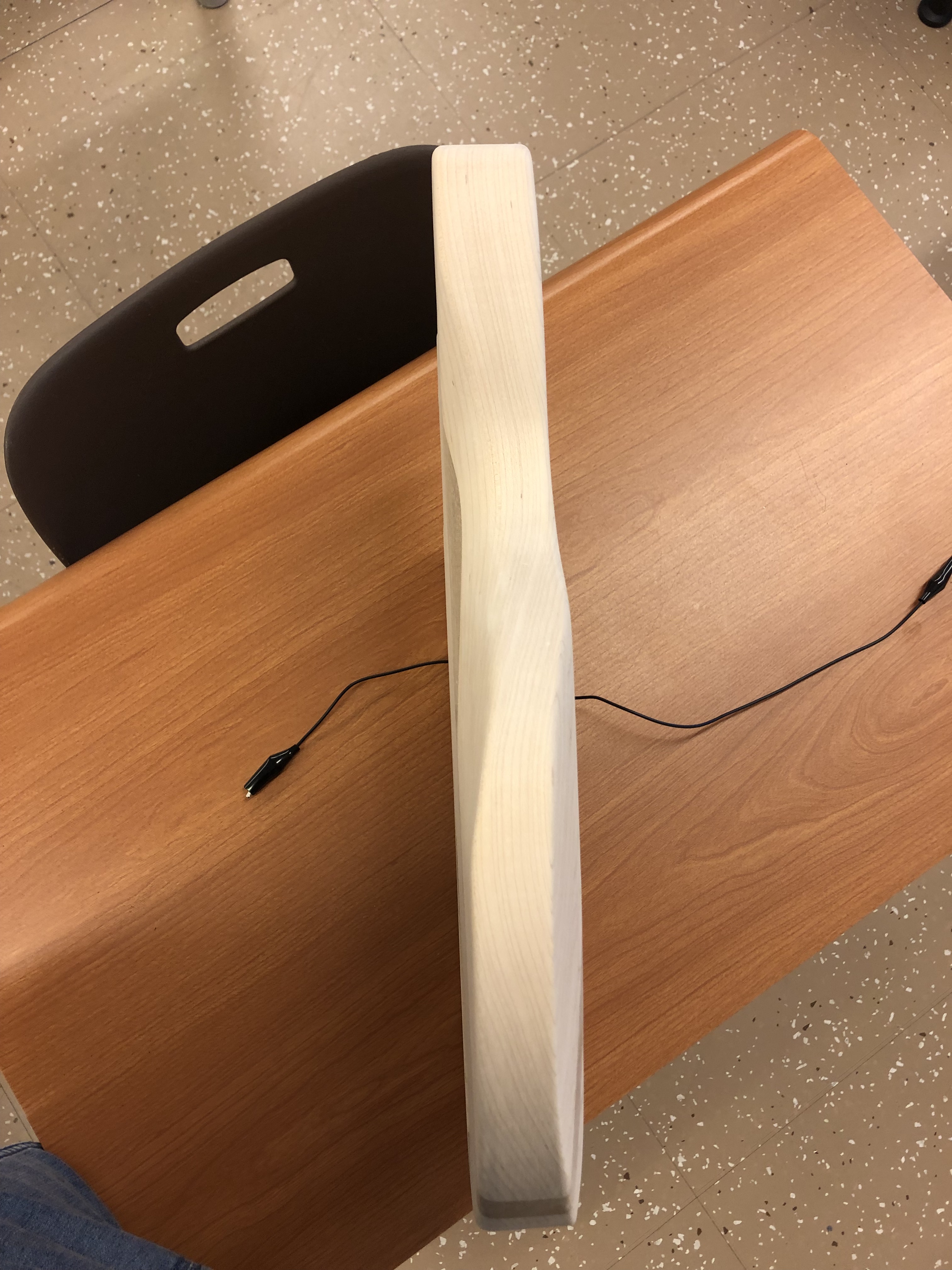 Accomplishments: This week I did something similar to what I did last week, but instead of doing an arm but I did a belly cut. Mr. McCormick drew out a guiding line to shape out the cut of the belly carve. Using a gritty file I filed away the excess wood until I reached the line. Using the random orbital sander I smoothed out the marks and bumps in the wood. I also used it to smooth out the flat surfaces on both sides of my body. Finally, using 150, 220, and 320 sandpaper I started to smooth out the entire body so that it would feel the same all the way around. By shaping the guitar body and making the arm and belly cut, I am making the body lighter and also helping it to curve to somebody’s body when they are playing it