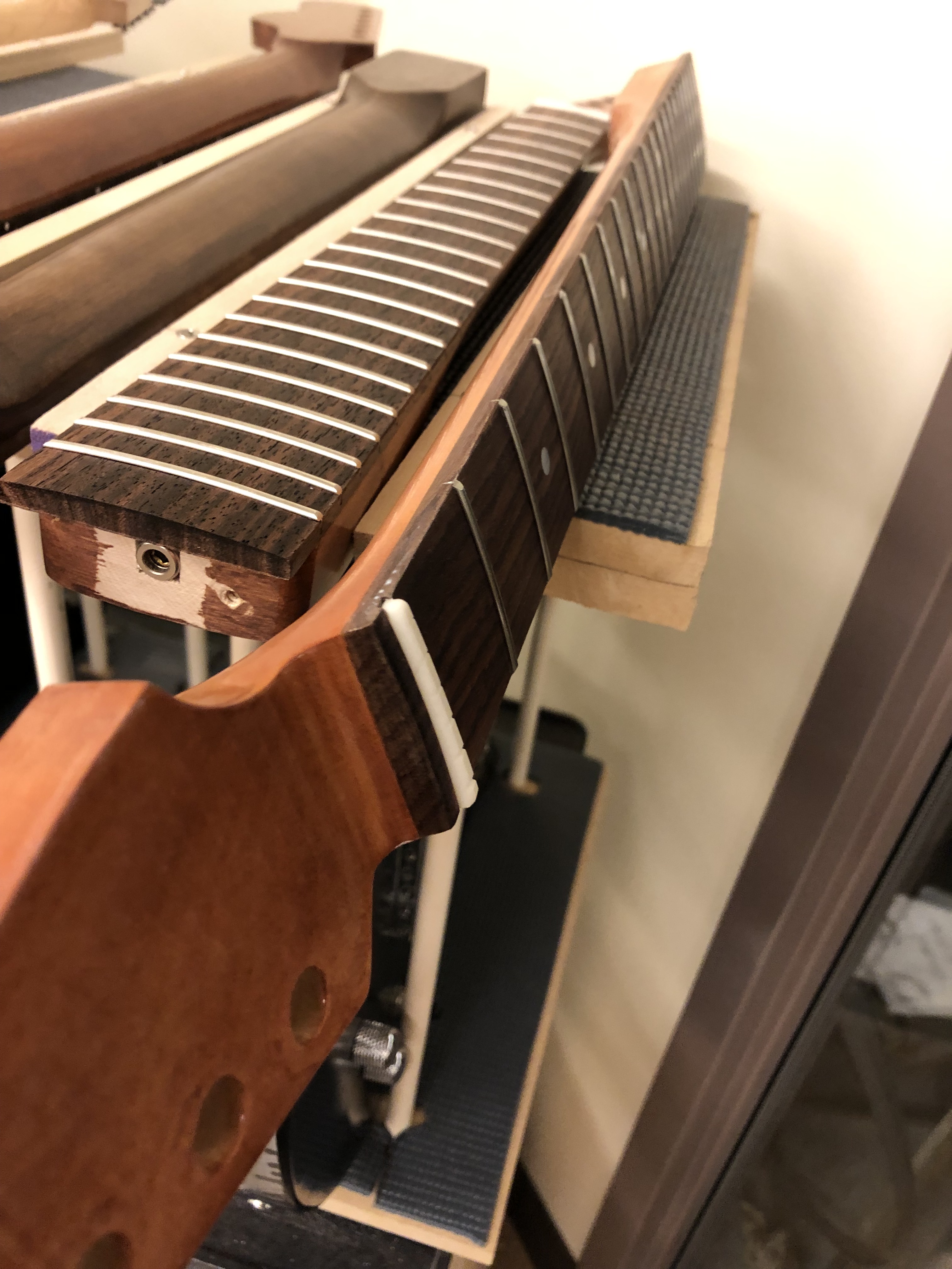 Learned: This week I learned that you have to break the seal on the fingerboard from the clear coat so that when you remove the tape, none of the wood chips off