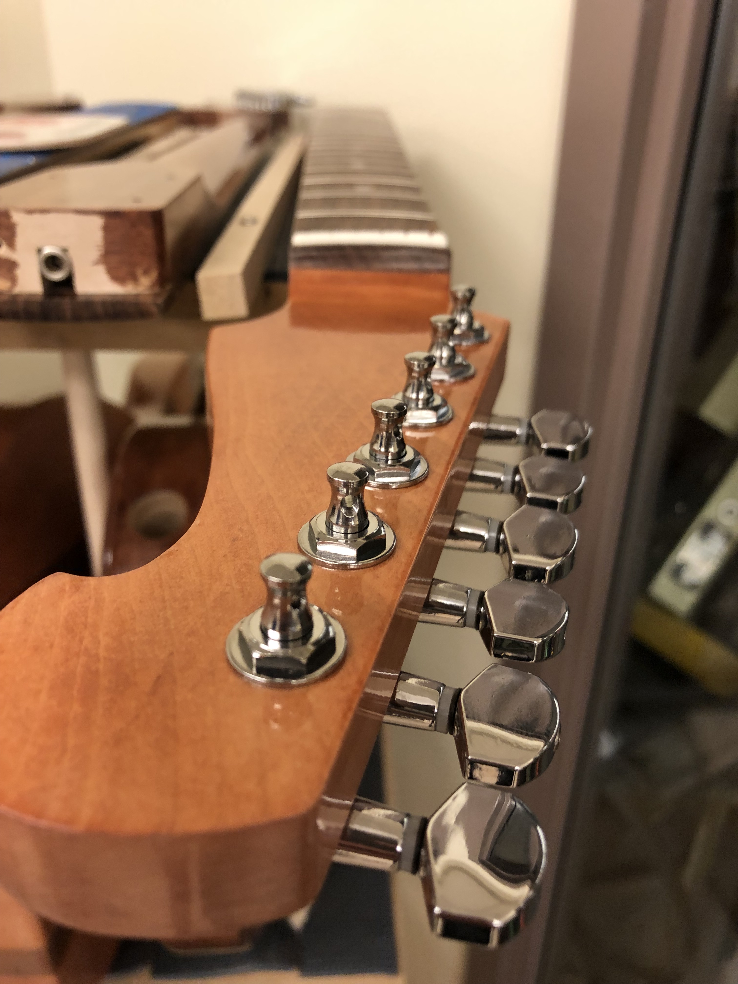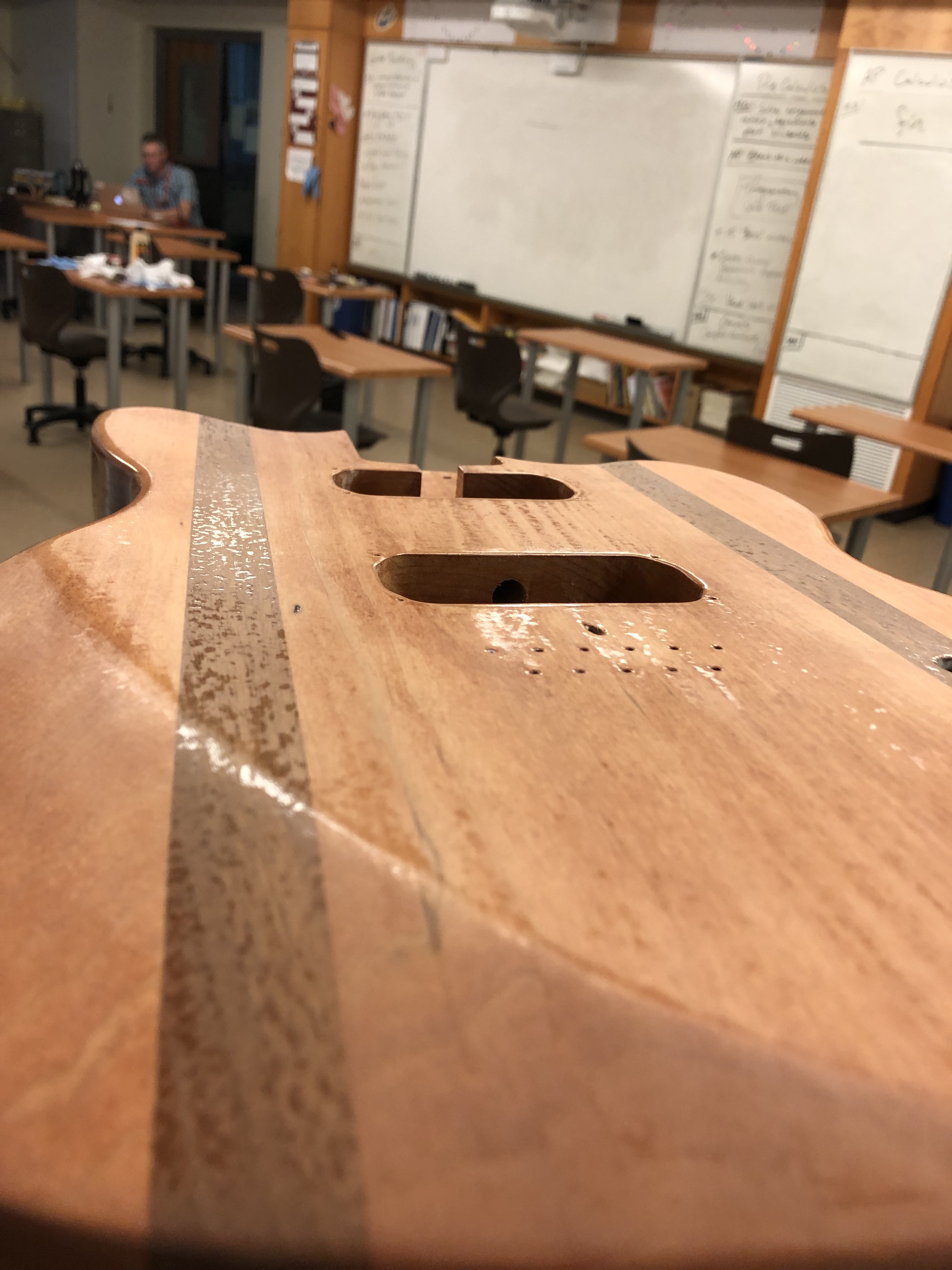 Accomplishments: This week I put in my tuners into my headstock. I also polished my neck and head to make is shinny and began polishing my body. We are using a wood block and 1,000 grit sand paper with water to remove the excess clear coat and make it uniform on the body. I will continue with that next week going in to the 2,000 and 3,000 grit paper until I put the polish