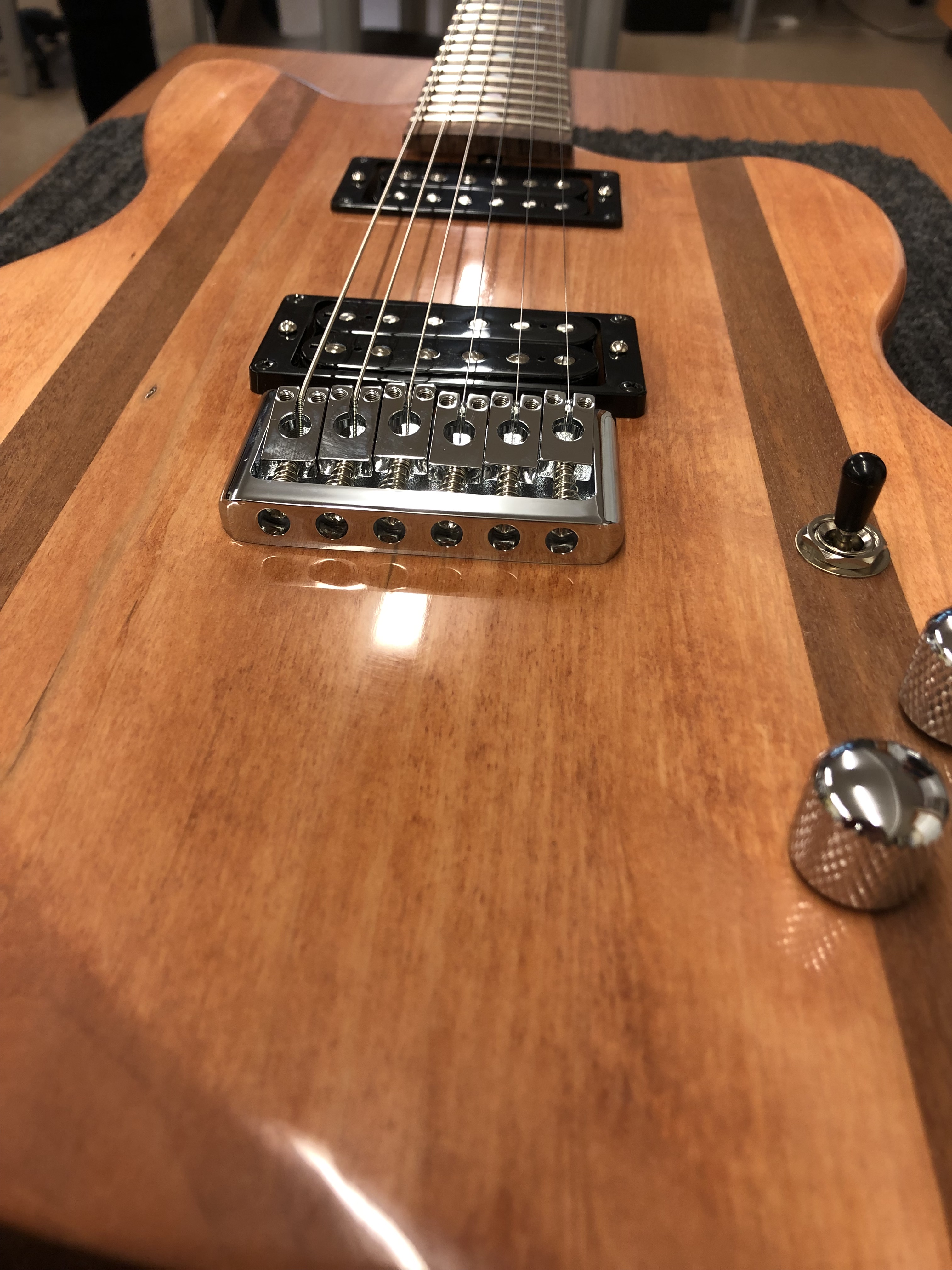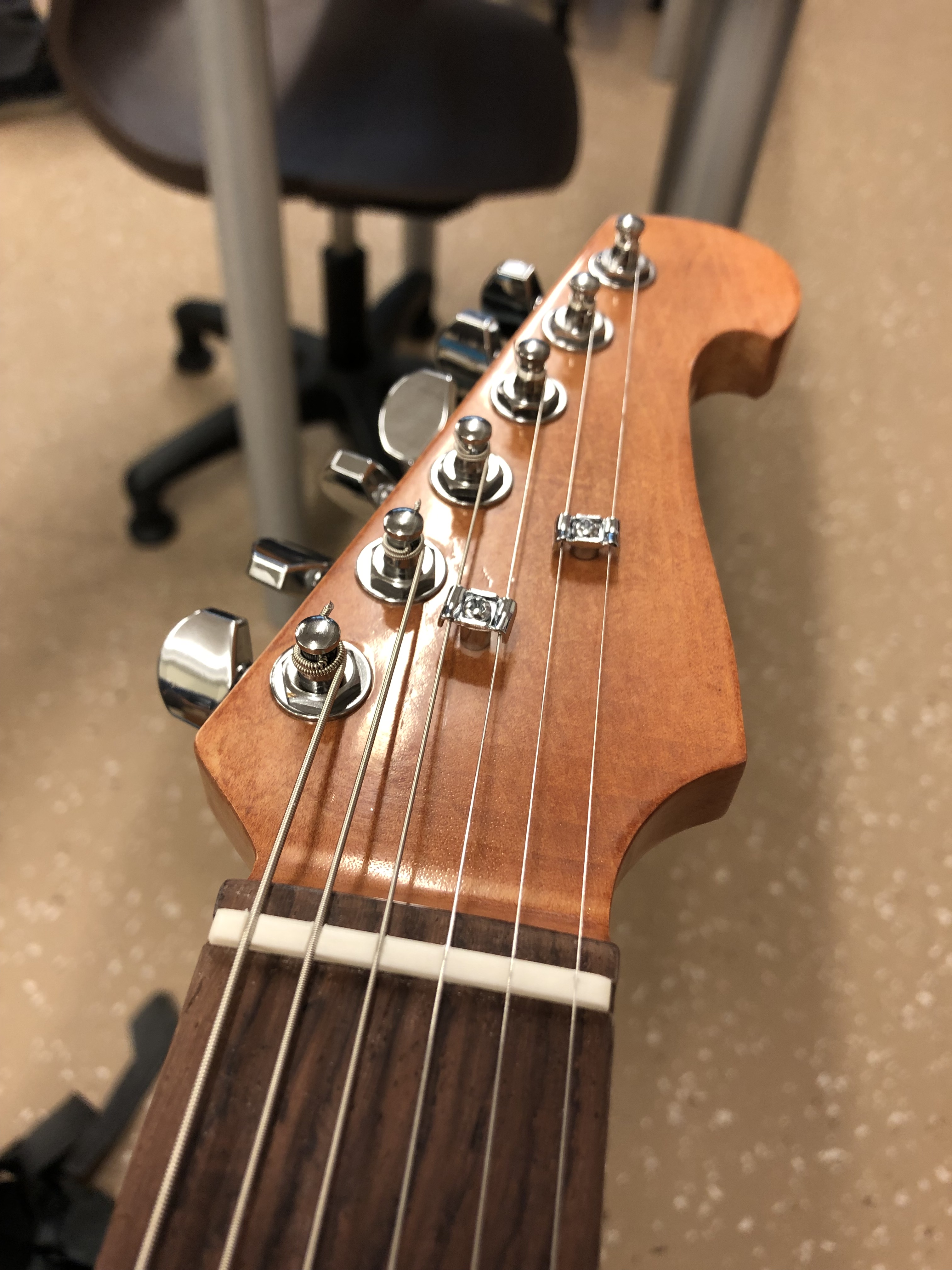 To start our final step of the guitar building process, I installed the bridge and adjusted the saddle. We started with the high E and measured out 25 1/5″ to the nut. After the first measurement was made we adjusted the other saddles to accommodate it. I then installed the strings that started in the back at the string ferrules. I then had to raise the saddles so that the strings are not all resting on one fret. We then filed the nut slots down to bring the strings to the correct height above the first fret position. Strings trees were put in to create a break angle over the nut to stop the vibration at the nut. We didn’t need to put them on the low E and B string because they already create a break angle. I then turned the strings and did intonation. Intonation is when you adjust the saddles and and strings to make sure that when I play the open E and even on the twelfth fret (next octave above) are the same note. Lucky for me there was no need to tweak any of it! And then, just like that, it was done!